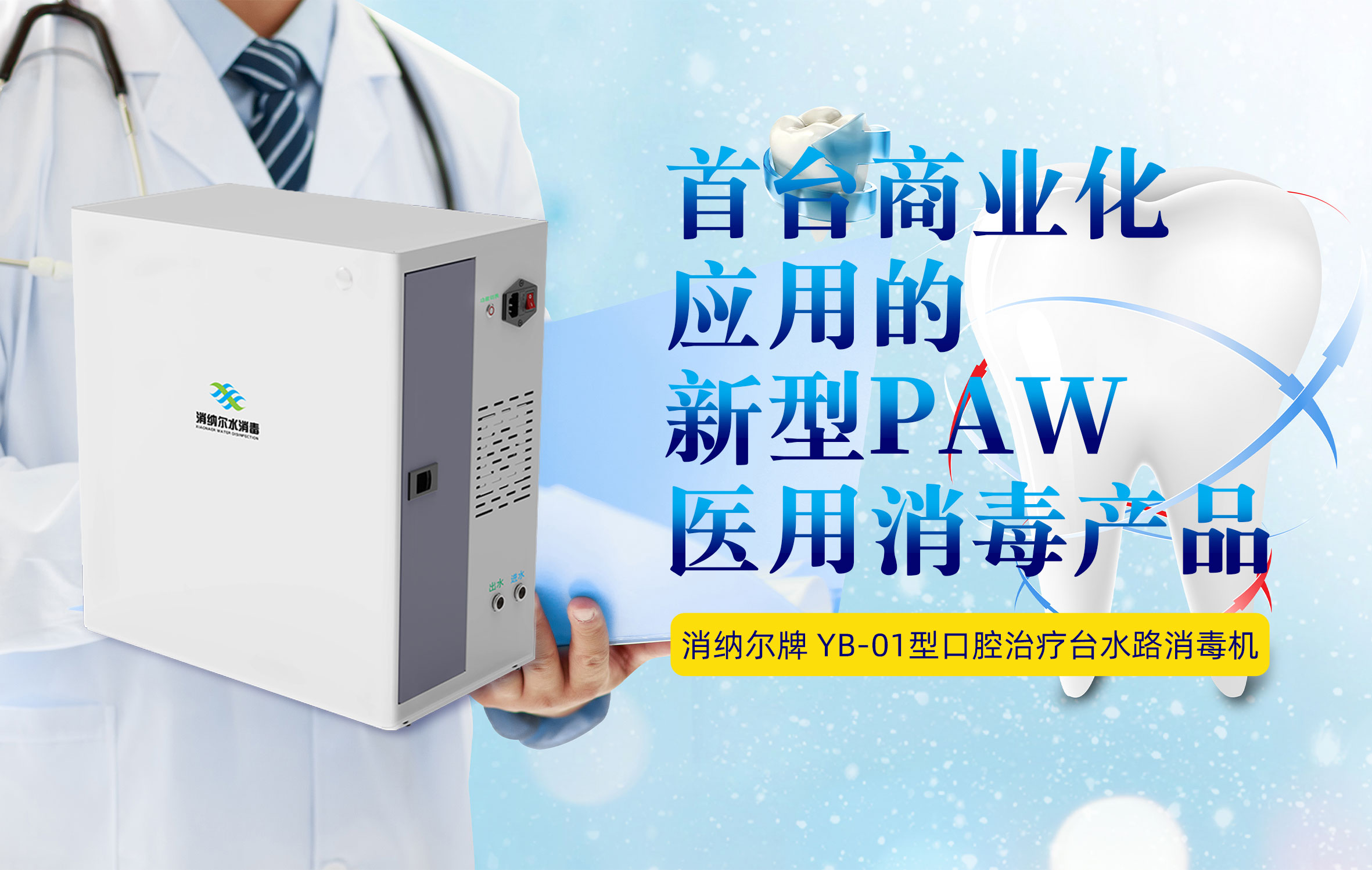 首臺商業化應用的新型 PAW 醫(yī)用消毒產品,消納爾牌口腔治療臺水路消毒機